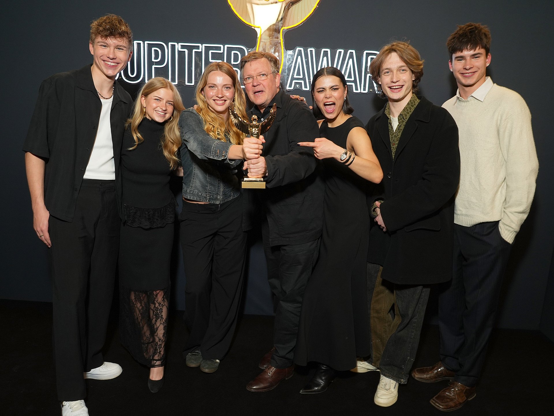 Foto: v.l.n.r.: Leonard Conrads, Emilia Pieske, Emilia Maier, Justus von Dohnányi, Tomomi Themann, Philip Müller, Loris Sichrovsky (Foto © Jason Harrell für Burda)